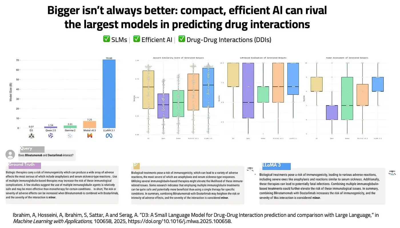 ”D3: A Small Language Model for Drug-Drug Interaction prediction and comparison with Large Language Models” introduces a 70 MILLION (yes, six zeros, not nine) Llama-like model that is on par with Llama-3.1 70B for drug interaction prediction. It was trained and fine-tuned from scratch in 2.5 hours on a single A100.