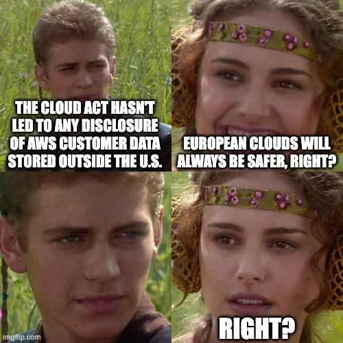 AWS, in their own compliance documentation, helpfully points out that “the CLOUD Act is also applicable to a cloud service provider that is headquartered in the EU and has operations in the United States.” They even name-drop OVHcloud specifically: “OVHcloud, a French headquartered cloud services provider that operates in the U.S., notes in its CLOUD Act FAQ page that ‘OVHcloud will comply with lawful requests from public authorities. Under the CLOUD Act, that can include data stored outside of the United States.’”[3]