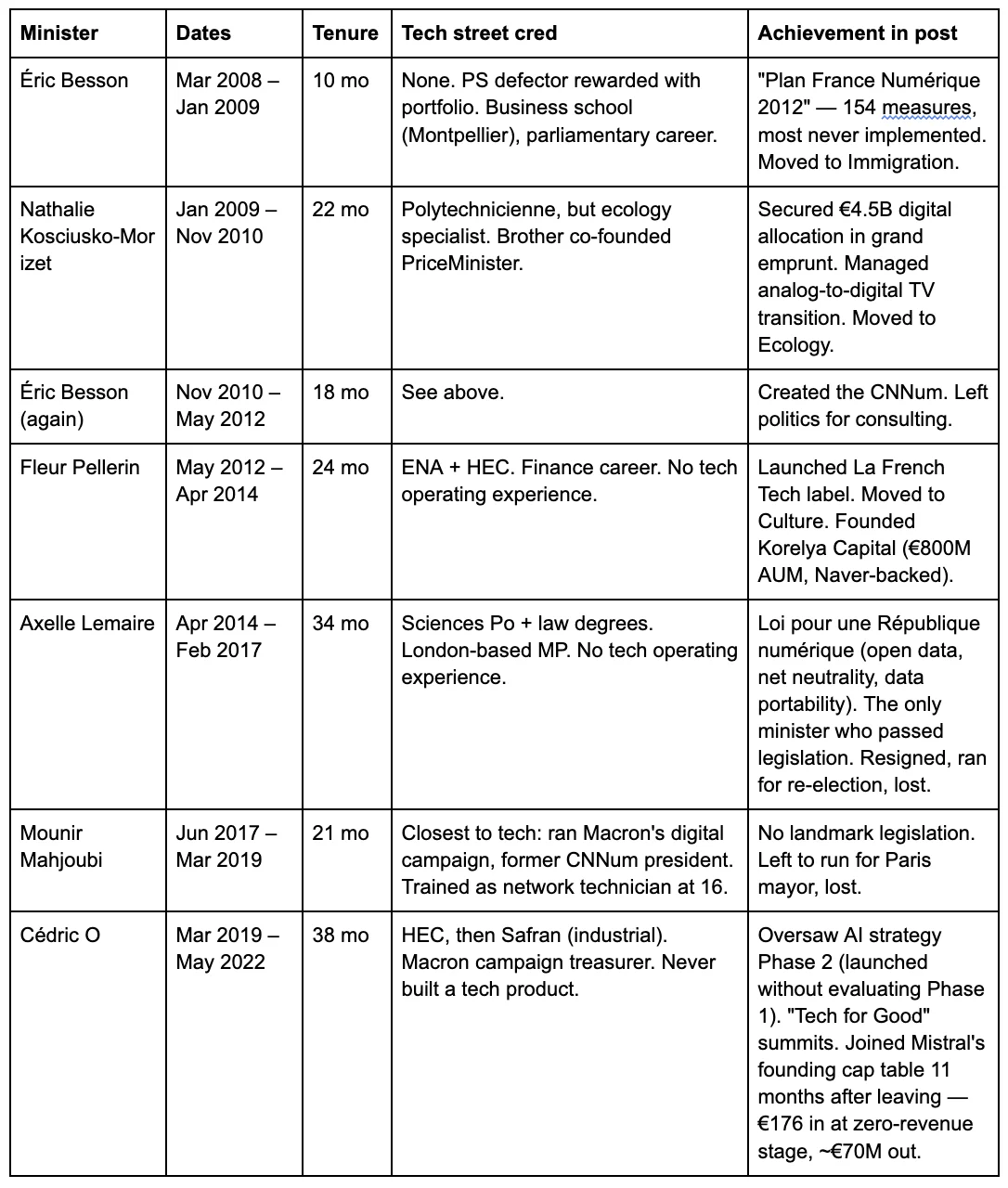 Four more followed — Barrot, Ferrari, Chappaz, Le Hénanff — none with tech operating experience, none lasting longer than twenty months, none passing legislation.[34]
