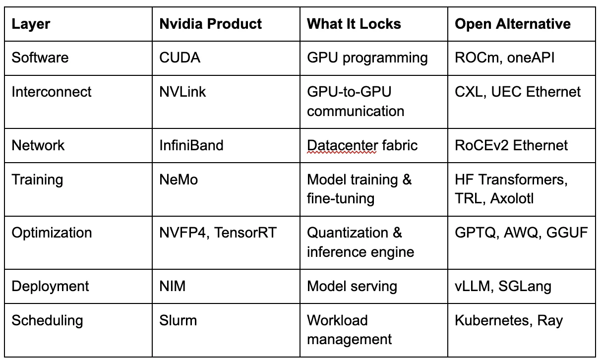 The question is not whether Nvidia is doing good work. It is. The question is whether the structural incentives of a hardware monopolist that controls the dominant open model family, the enterprise deployment stack, the training infrastructure, the networking layer, and now the scheduling layer create forces that undermine hardware choice over time. The pattern evidence across eight domains and 18 years of CUDA history suggests they do.
