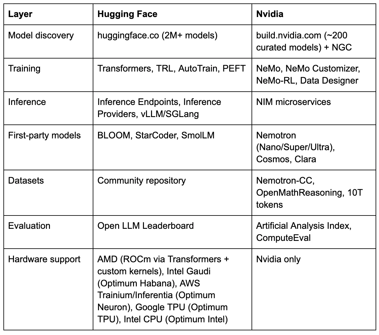 Competition benefits developers. Hugging Face’s Inference Providers and the open-source inference ecosystem (vLLM, SGLang, and others) exist as alternatives to NIM — though HUGS, HF’s most direct NIM competitor, was deprecated in September 2025 after failing to gain enterprise traction. The multi-vendor inference market is better for practitioners than any monopoly would be. Nvidia’s open model push has also accelerated open dataset publishing, benefiting the entire ecosystem. And Nvidia’s primary target may not be Hugging Face at all — it may be the hyperscalers’ proprietary model APIs (Azure OpenAI, Bedrock, Vertex AI), with HF caught in the crossfire of a larger fight for who owns the enterprise model layer.