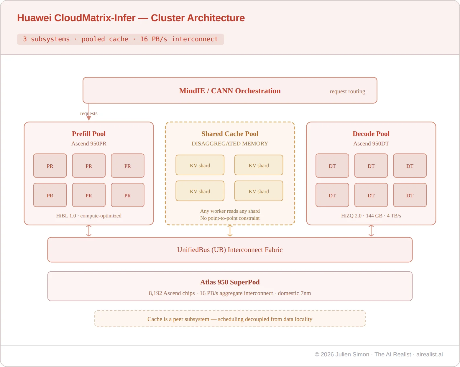 The Atlas 950 SuperPod, scheduled for late 2026, deploys 8,192 Ascend chips with an aggregate interconnect bandwidth of 16 petabytes per second.[30] This is not software disaggregation on identical GPUs. This is an entire inference architecture designed from first principles, based on the observation that prefill, decode, and memory are three distinct problems that require distinct optimizations.