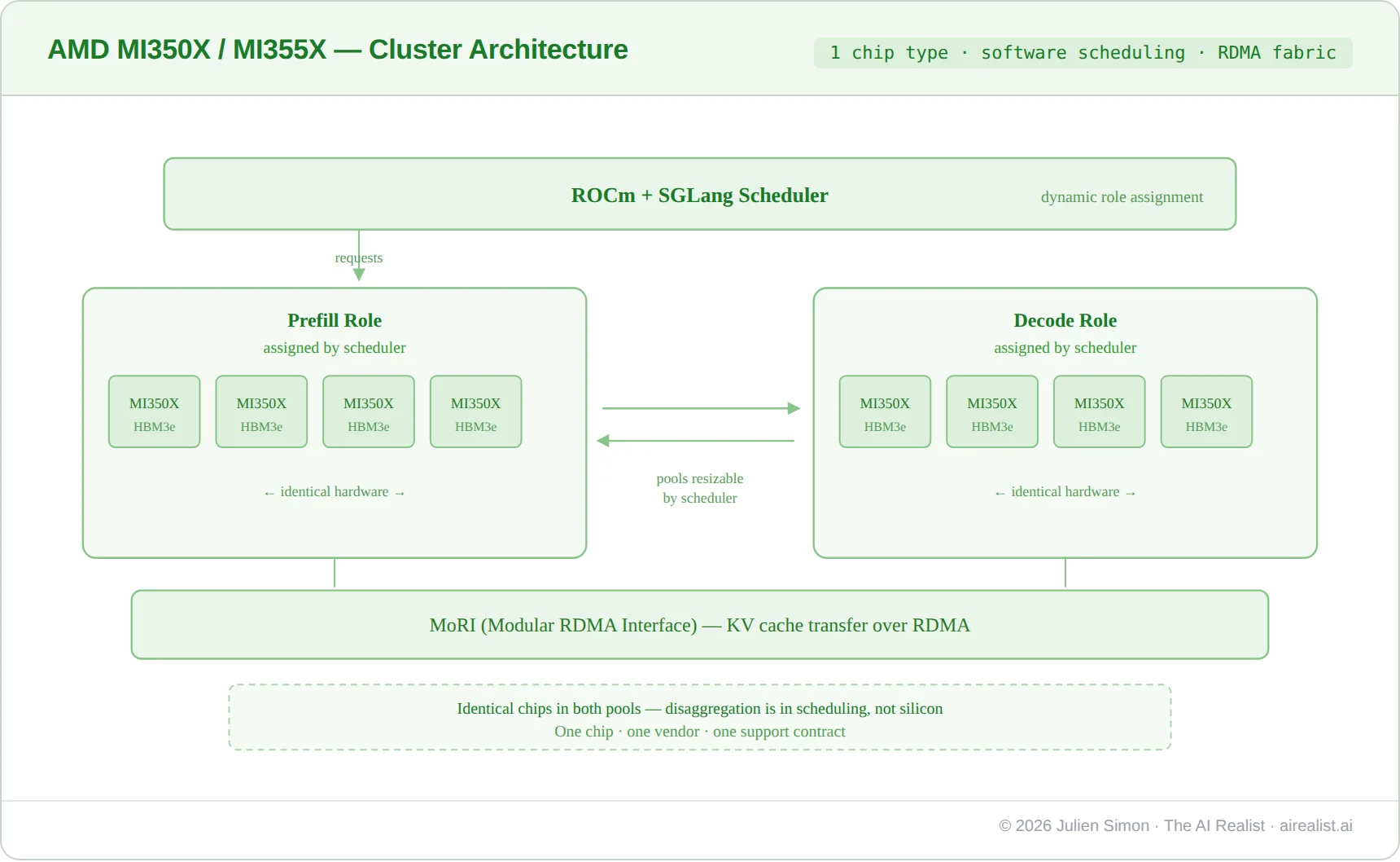 AMD occupies the middle ground. Its MI350X and MI355X ship with software-level disaggregation support: separate GPU pools for prefill and decode, with AMD’s MoRI interface handling KV cache transfer over RDMA.[32] But AMD uses the same chip on both sides. The disaggregation is in scheduling, not in silicon. This is technically sound and delivers real gains, but it does not capture the architectural advantage of phase-specific hardware. The tradeoff is operational simplicity: one chip, one vendor, one support contract — advantages that matter to enterprise customers who lack the engineering depth to manage multi-vendor silicon in a single inference request.