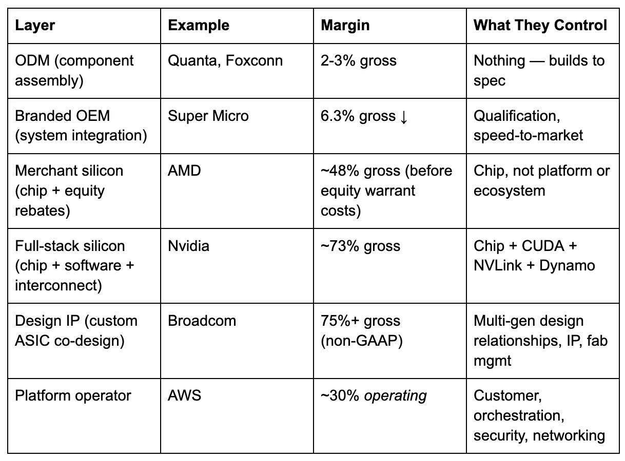 Now consider the other end. AWS operates at roughly a 30 percent operating margin.[37] Nvidia operates at roughly 73 percent gross margin.[38] Broadcom — which designs Google’s TPUs, Meta’s MTIA accelerator, and Anthropic’s custom chips, among others — operates at non-GAAP gross margins above 75 percent.[39] The margin gradient from ODM to OEM to chip vendor to platform operator is not random. It maps to control: whoever owns the layer that makes the adjacent layers interchangeable captures the most value.