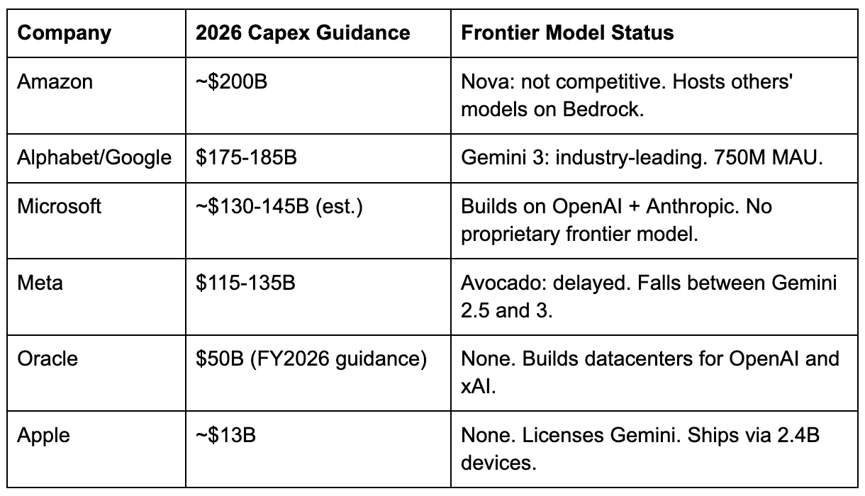 [74] The grid analyzes the six largest AI infrastructure investors by 2026 capex. Private companies (xAI, Anthropic, DeepSeek) and Chinese labs (Baidu, Alibaba, ByteDance) operate under different capital structures, regulatory environments, and disclosure requirements. The framework applies to any company; these six illustrate the range of structural positions.