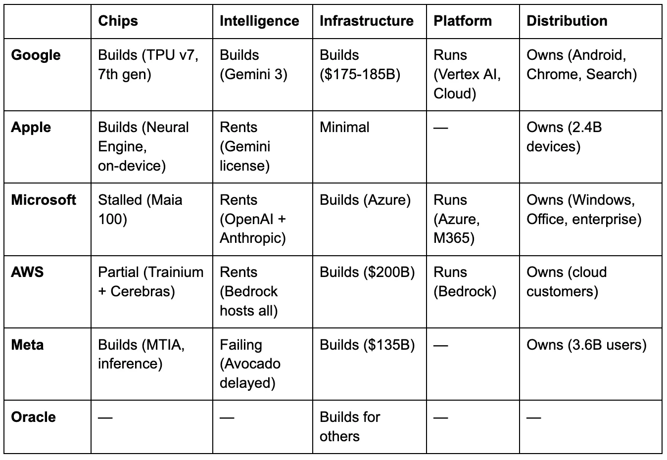 The grid identifies, in one framework, why Google can survive almost anything, why Apple’s restraint may be prescience, why Microsoft is hedging in real time, why AWS’s reversions strengthen rather than weaken it, and why Meta is the only company in the grid that destroyed its position at the one layer its business model cannot survive without.