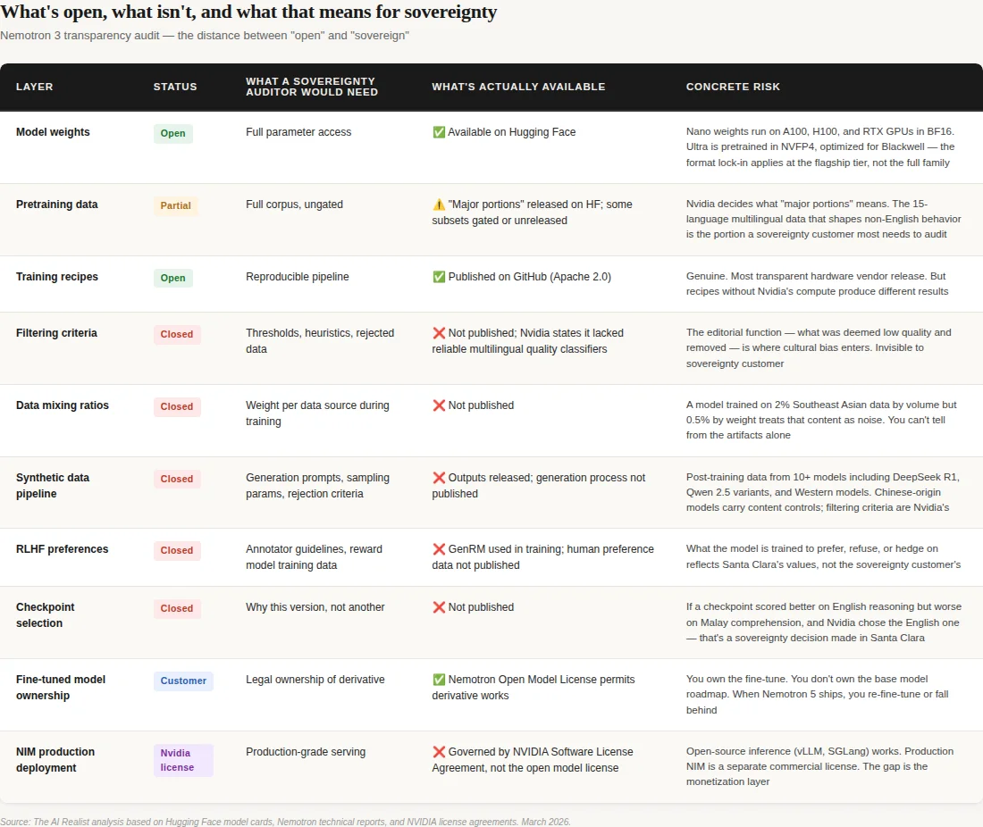 [53] Nvidia’s Nemotron is genuinely more open than Meta’s Llama (more restrictive license, no training data), Anthropic’s Claude (closed everything), or Google’s Gemini (closed weights, closed data). The transparency is real. The argument is not about openness relative to competitors. It is about openness relative to what sovereignty requires — and on that standard, every “closed” row in the table is a governance decision made in Santa Clara that the sovereignty customer cannot see, challenge, or change.