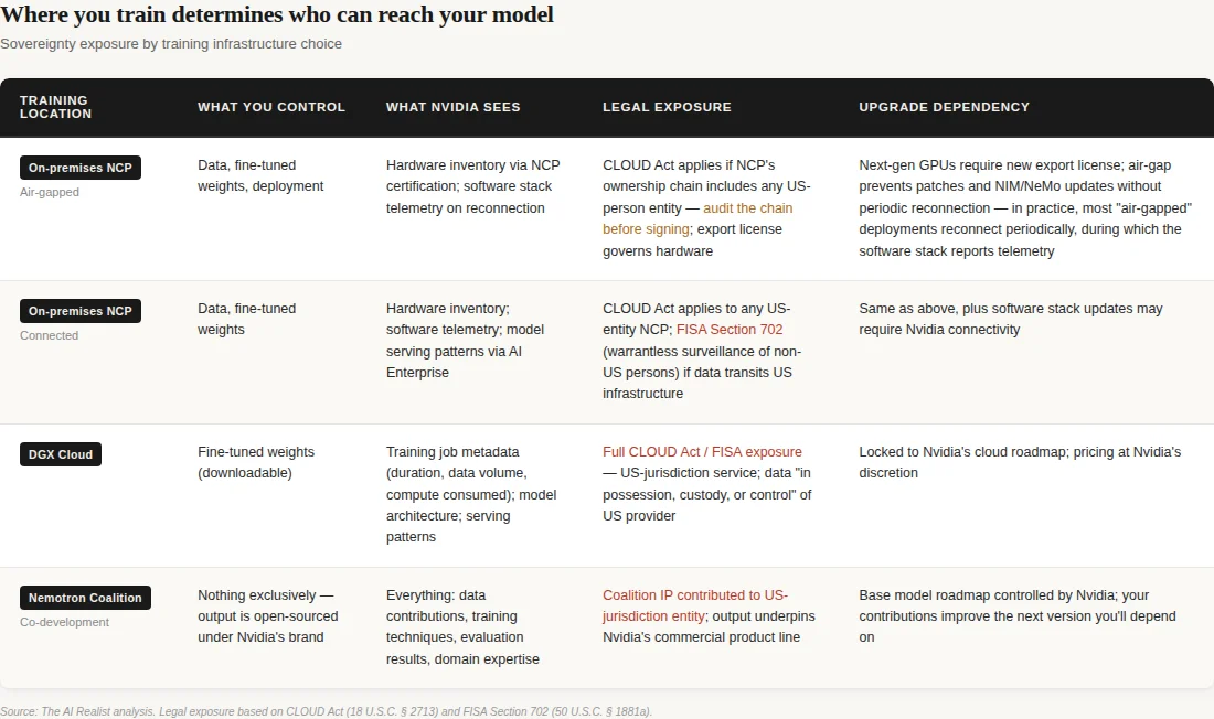 Move to models. The Nemotron Coalition’s first base model will be trained on Nvidia’s DGX Cloud — a US-jurisdiction service.[12] Coalition members — including the two most explicitly associated with national sovereignty, Mistral and Sarvam — will contribute their expertise to a model that carries Nvidia’s brand and trains on Nvidia’s cloud.
