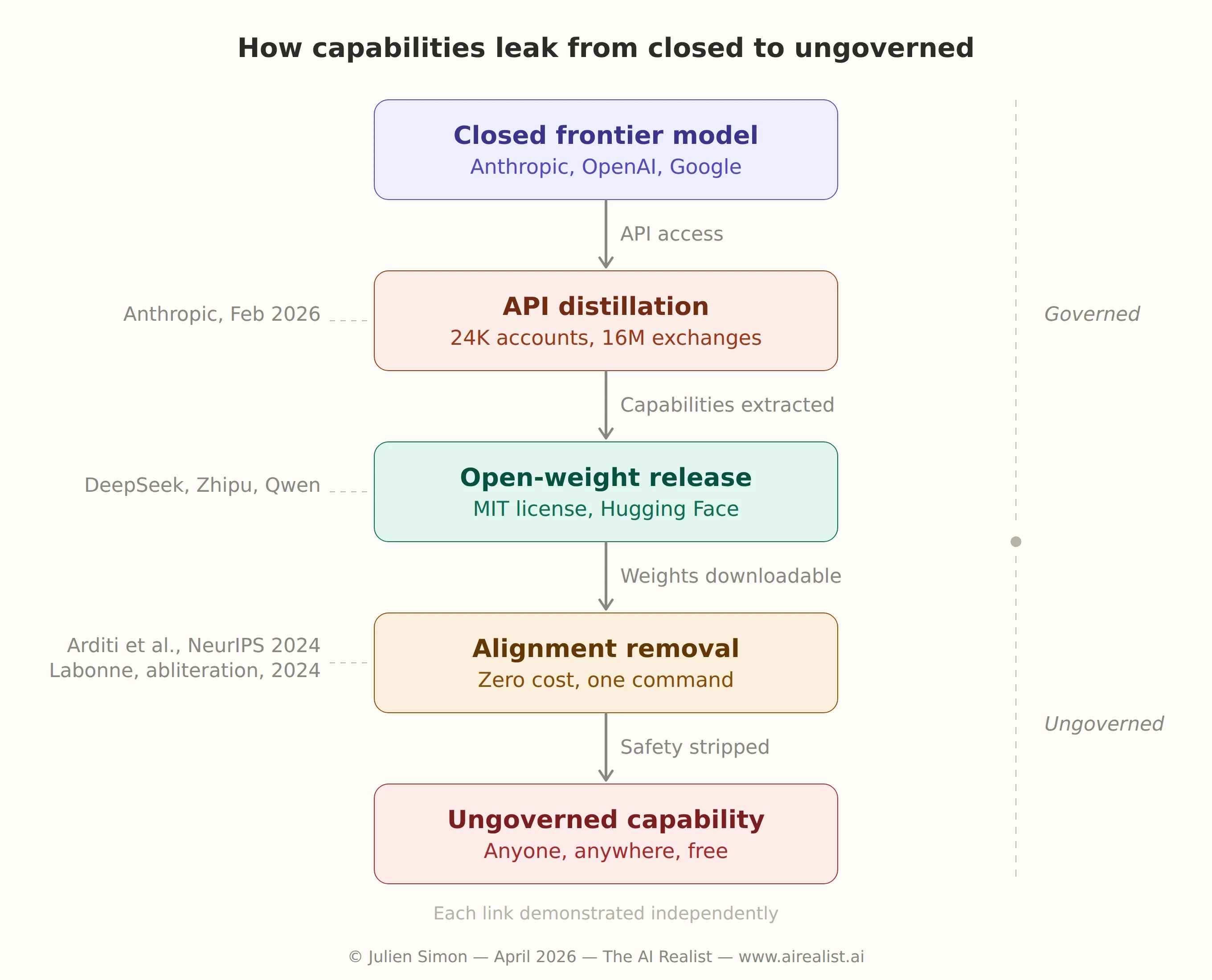 Each link in this chain has been demonstrated independently. Anthropic documented the distillation. Zhipu documented the open-weight release. Arditi et al. documented the removal of alignment. The full sequence has not yet been traced end-to-end in a single case but every component is operational, and the direction is clear.